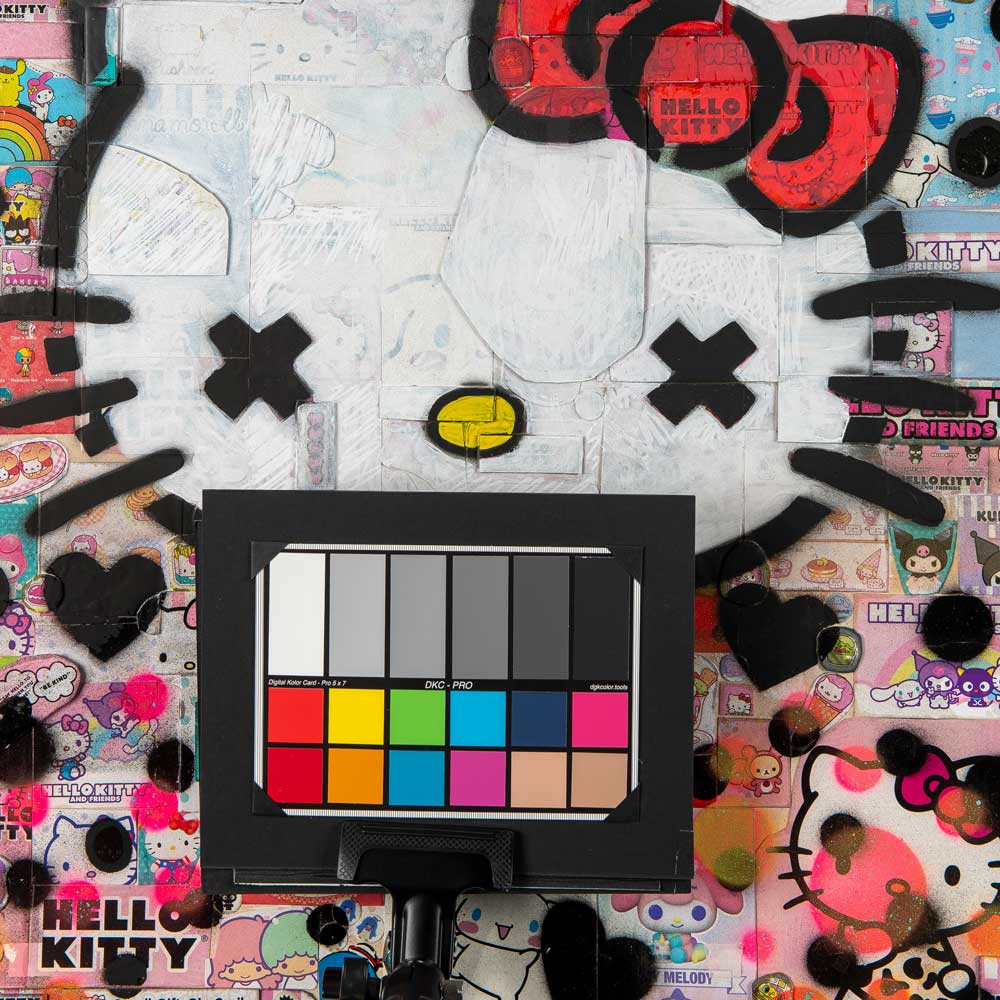 Mixed media art by April Garcia shown with color calibration chart for white balance.